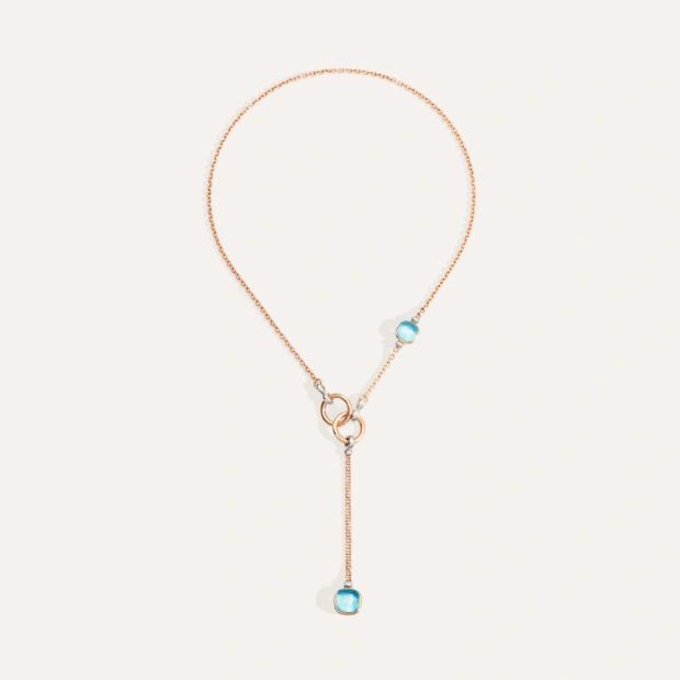 Erstmals erstrahlt NUDO in einer Halskette, die auf drei Arten getragen werden kann: als klassische Sautoir- oder als Lariat-Kette mit Anhänger, oder zweireihig um den Hals geschlungen. Erstmals zeigen die NUDO-Steine den zweiseitigen „Clessidra“-Schliff, mit dem sich die ganze Kostbarkeit dieses Edelsteins entfaltet.