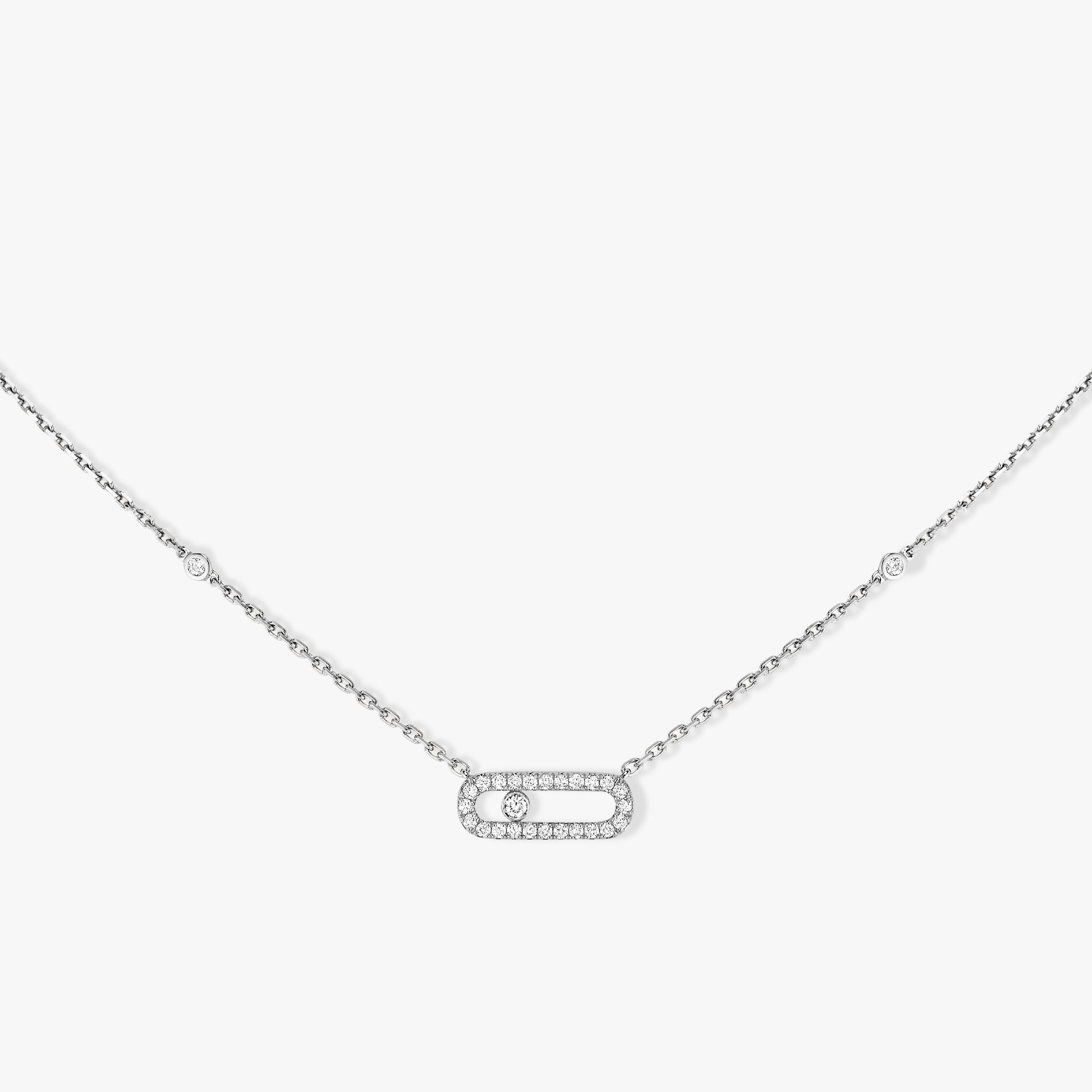 Diese mit einem beweglichen Diamanten im Brillantschliff besetzte und mit Diamanten ausgefasste Diamantkette aus 18 Karat Weißgold wurde von Hand angefertigt und ist Teil der Kollektion Move, dem charakteristischen Design der Schmuck-Maison Messika. Die feine Kette aus Weißgold ist mit dem kostbaren Move Käfig verziert, der mit Diamanten ausgefasst oder mit einem einzelnen Diamant im Clos-Coulisse-Stil verziert ist und mit jeder Bewegung schillert. Eine Damenhalskette aus Diamant für den Alltag, der jedem Look einen Hauch Glanz verleiht. Das diskrete Schimmern des Weißgoldes, das den Schmuck bildet, macht ihn zu einem beliebten Metall sogar für Frauen, die nicht regelmäßig Diamantschmuck tragen. Die Weißgold-Kette Move Uno mit Diamant passt somit zu jedem Outfit und verstärkt die natürliche Verführungskraft ihrer glücklichen Trägerin.