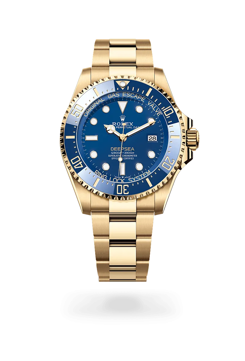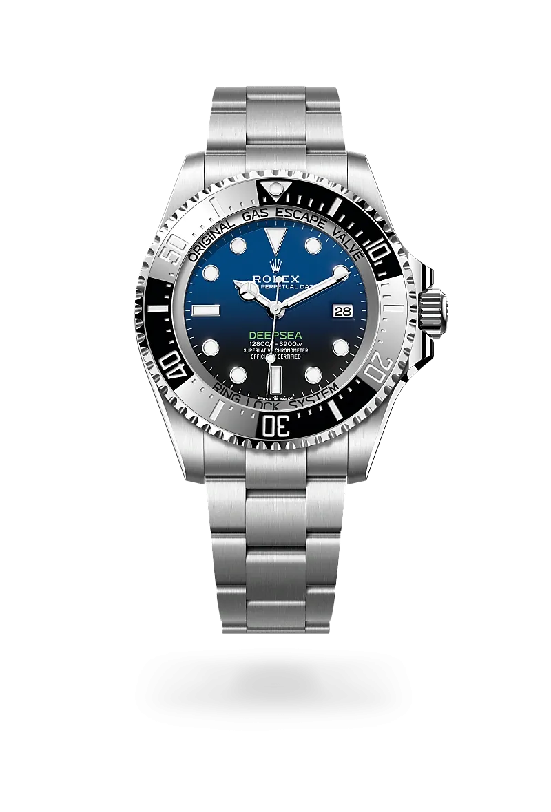 Die Rolex Deepsea in Edelstahl Oystersteel ist mit einem tiefschwarzen Zifferblatt oder einem Zifferblatt D-blue erhältlich. Sie verfügt über eine in eine Richtung drehbare Lünette mit graduierter Cerachrom-Zahlenscheibe aus schwarzer Keramik. 2024 präsentierte die Marke eine Version in 18 Karat Gelbgold mit einem blauen Zifferblatt und einer Cerachrom-Zahlenscheibe aus blauer Keramik.