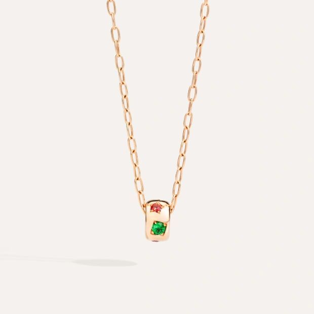 Halskette mit Anhänger aus 18 Kt Roségold mit 1 orangefarbenem Saphir „treated“ (≈0.1 ct), 1 blauem Saphir (≈0.1 ct), 1 rosa Saphir (≈0.1 ct), 1 Tsavorit (≈0.1 ct), 1 rotem Spinell (≈0.1 ct) und 1 Tansanit (≈0.1 ct).